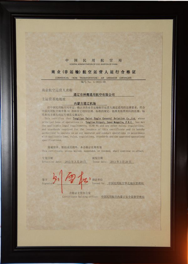 2013年3月28日,通遼神鷹通用航空有限公司CCAR-91部運行合格審定頒證儀式在神鷹通航召開。神鷹通航孫學慧副總經(jīng)理主持了本次會議,內(nèi)蒙古監(jiān)管局副局長李陸康向通遼神鷹通用航空公司頒發(fā)了《商業(yè)非運輸航空運營人運行合格證》, 內(nèi)蒙古機場集團公司通遼分公司領(lǐng)導(dǎo)參加了頒獎儀式。這是內(nèi)蒙古地區(qū)第三家獲得CCAR-91部運行許可的通用航空公司,也彌補了內(nèi)蒙古中東部地區(qū)通航事業(yè)的空白。